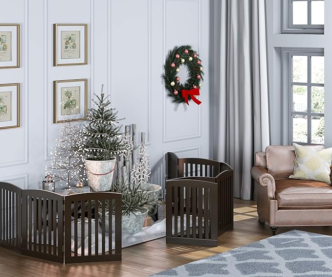 PAWLAND Wooden Freestanding Foldable Pet Gate for Dogs, 24 inch 4 Panels Step Over Fence, Dog Gate for The House, Doorway, Stairs, Extra Wide (Espresso, 24" Height-4 Panels)