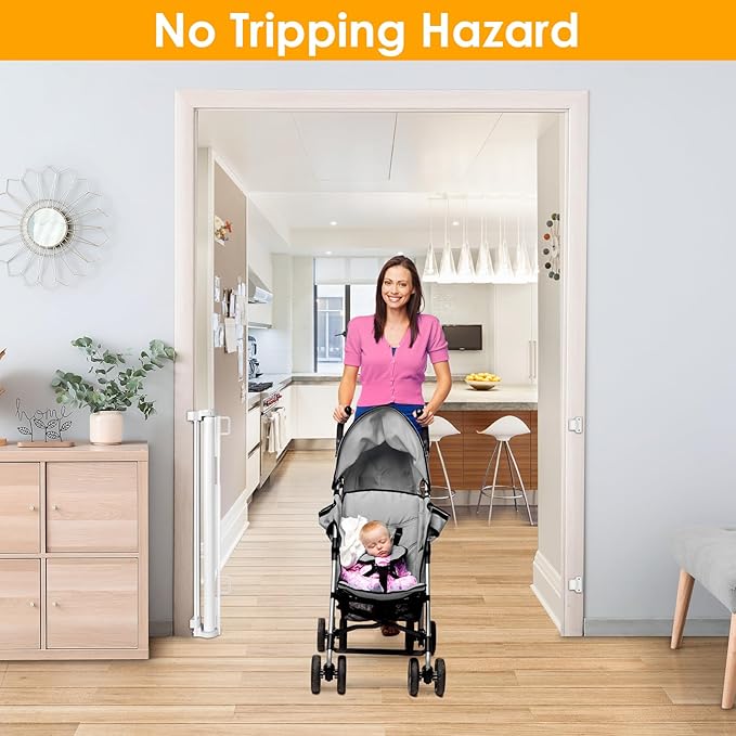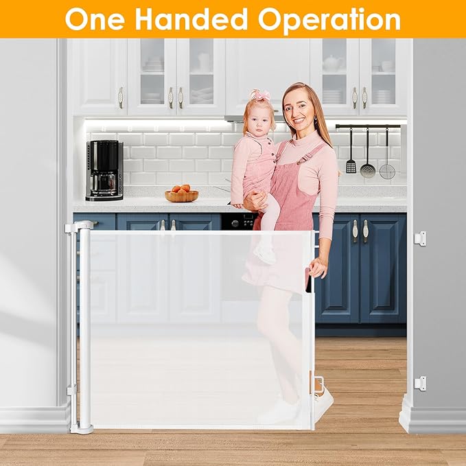 - Multi-scene Application:retractable baby gate can be used in living room, kitchen, laundry room, doorway, bottom of stairs, deck, porch, patio, Garage door, indoor, outdoor and other places. Doorway baby gates are suitable for babies and dogs to use and keep your children and pets in a safe environment