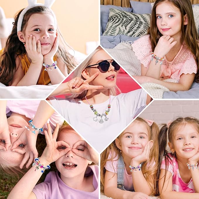- CONTAINS EVERYTHING YOU NEED: The bracelet making kit for kids includes colorful beads, cute dangle pendant, charming space beads, detachable bracelets, beautiful necklace string with clasps. All in one kit, just enjoy the fun of creating your unique bracelets, necklaces, anklet and jewelry crafts