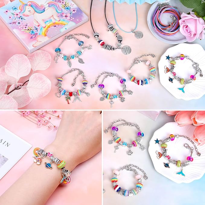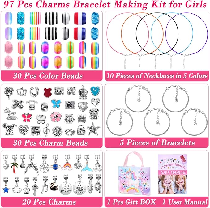- GREAT GIFT IDEAS: Thrilez DIY charm bracelet making kit for girls come with 30 metal spacer beads, 20 pendant charms with dangle, 20 rainbow beads, 10 glass beads, 5 snake chain bracelets, 10 necklace, 1 gift box and 1 user manual. This jewelry making kit is great for DIY arts and crafts