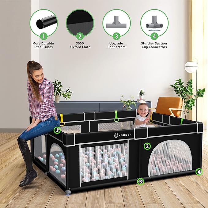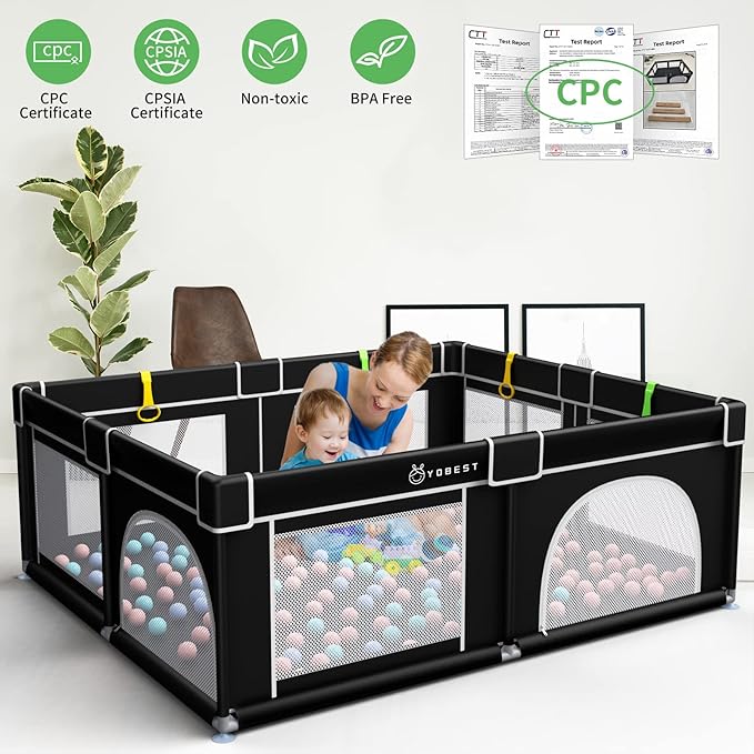 - SAFETY AND STURDY: YOBEST Baby playpens has passed US CPC certification and passed a number of security tests of ASTM F406-19. Made of resistant-duty encryption cationic fabric material and strong steel pipe, there are 4 sturdy safety non-slip suction cups on the bottom, which are difficult to move or tip over. At the same time, our fence is entirely wrapped in soft cloth, there is no danger of pinching, and it is safer than plastic baby playpen.