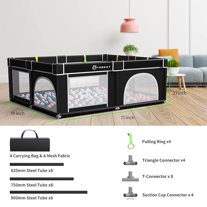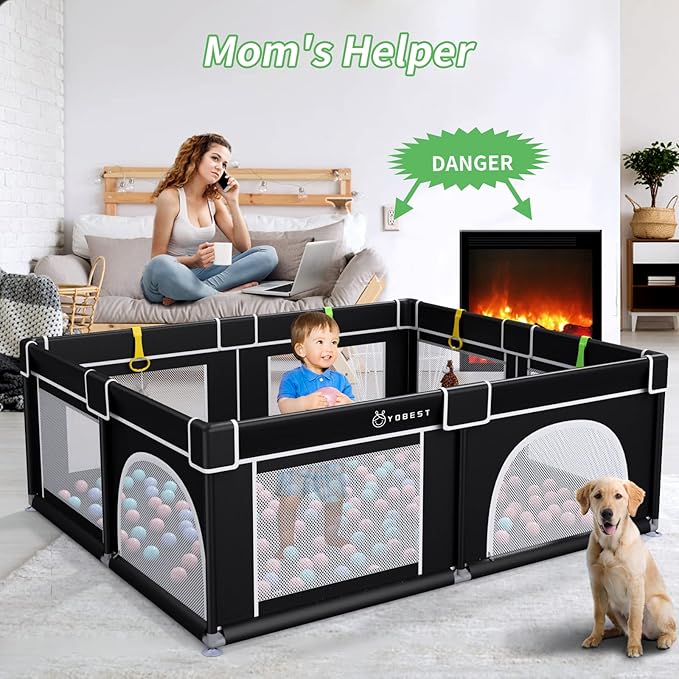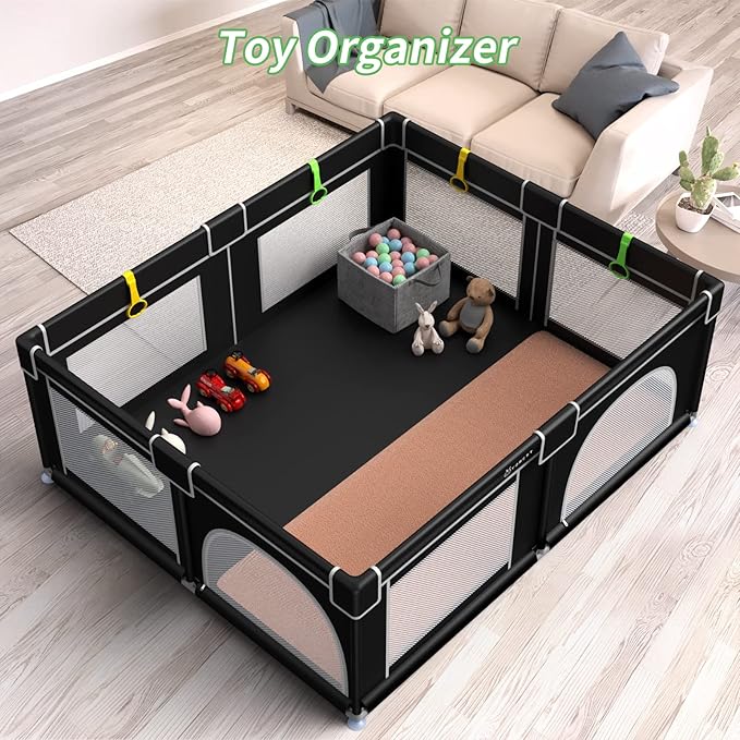 - 360°FULL VISION DESIGN:Big playpens for babies is surrounded by transparent and breathable grids. Whether the baby is lying or sitting, he can see the mother outside the fence. The baby play fence is outside the zipper to prevent the baby from accidentally climbing out. Plus you can keep all your baby's toys in one area away from the pet hair or getting knocked over.