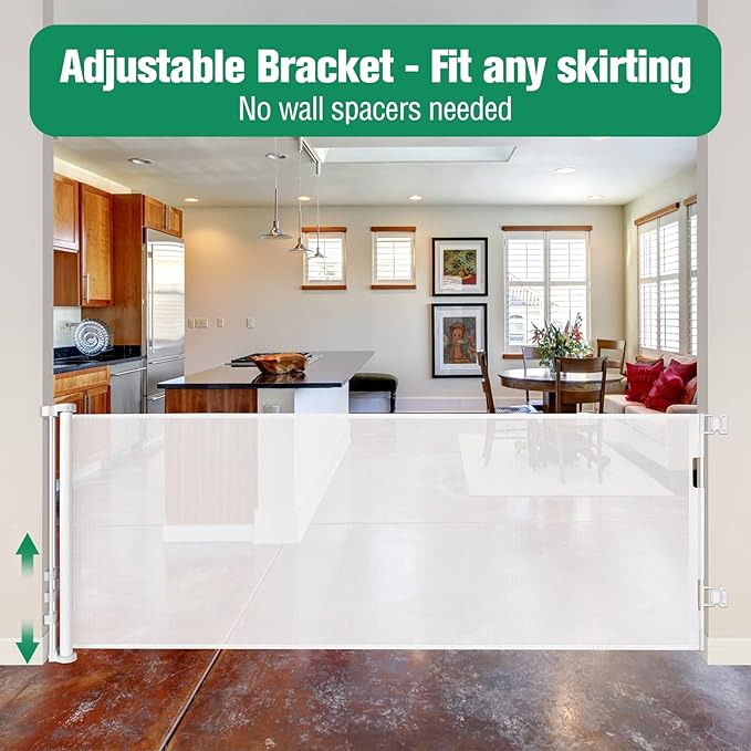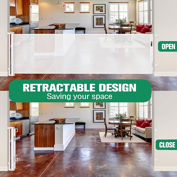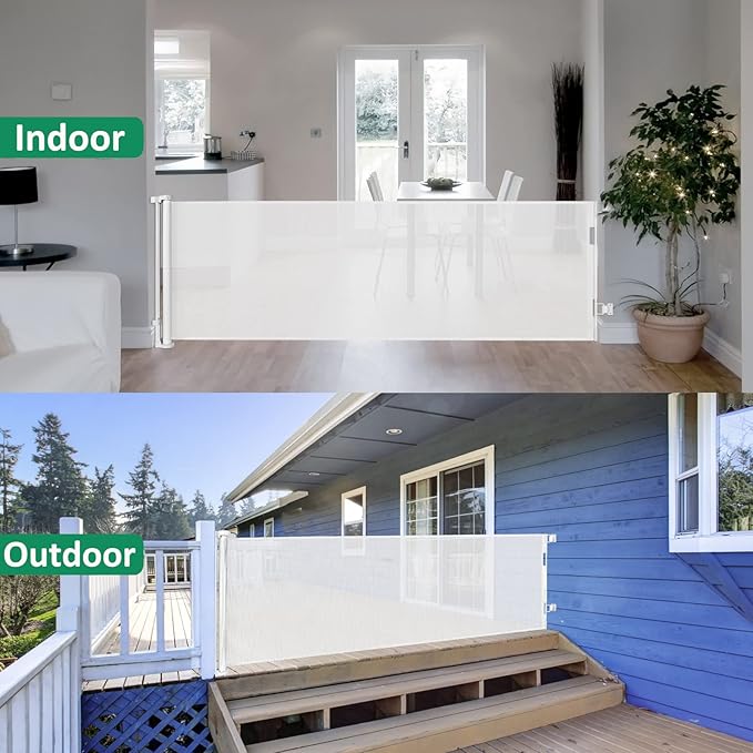 - [Perfect for Indoor and Outdoor] Each set contains 1 extra wide retractable gate and required mounting accessories. Retractable dog gate can be used for doorways, stairs and hallways both indoors and outdoors.