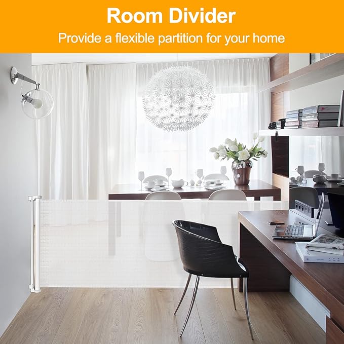 - [Retractable Gate ] You can roll it up when not in use, which saving your space. Unlike iron gate rails, this new retractable gate has no bottom rails - so there's no tripping hazard.Children and wheelchairs are easy to pass through, and elegant design works well with your home style. It is effective to stop your children from entering dangerous space.
