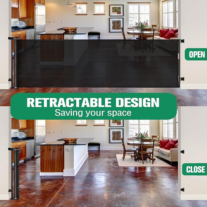 - Retractable Design - Space Saving: Retractable baby gates are easy to use in high traffic areas and can be used as semi-enclosed baby play yards, baby playpen, space divider barriers and more, such as easily separating a dining room from other open living areas. The retractable dog gate can be completely retracted without taking up space when not in use.