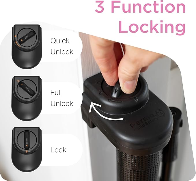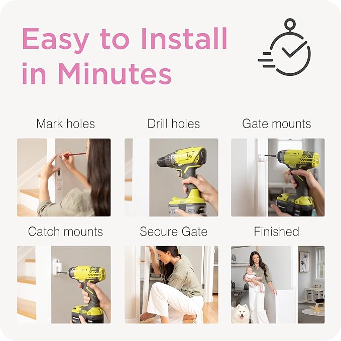 - ONE-HANDED OPERATION: Simple 2 step operation: 1. Push, twist, and release button; 2. Pull the handle to extend the gate.