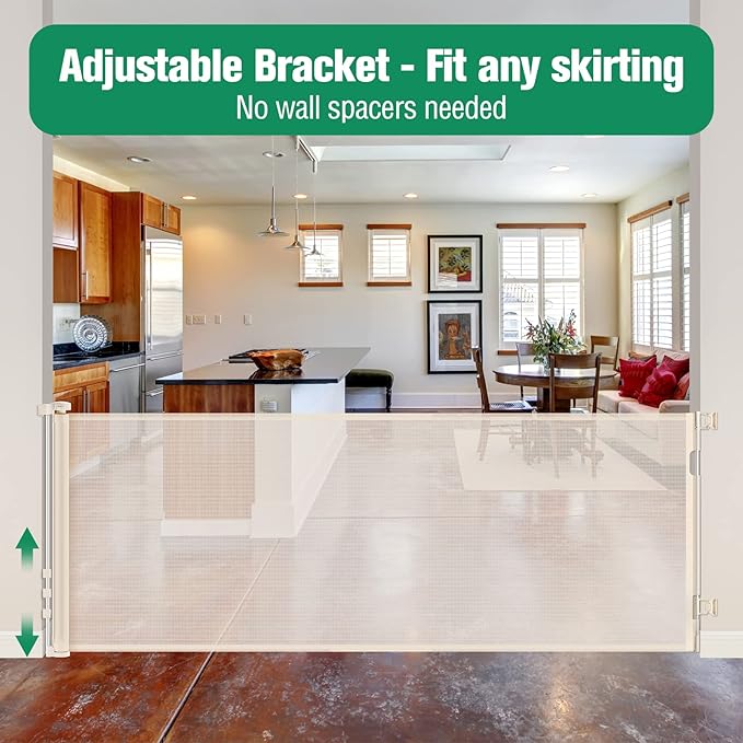 - [Fits Any Baseboard] This large baby gate has an adjustable lower bracket that fits any baseboard without wall spacers, making it safer, more practical and easier to install.