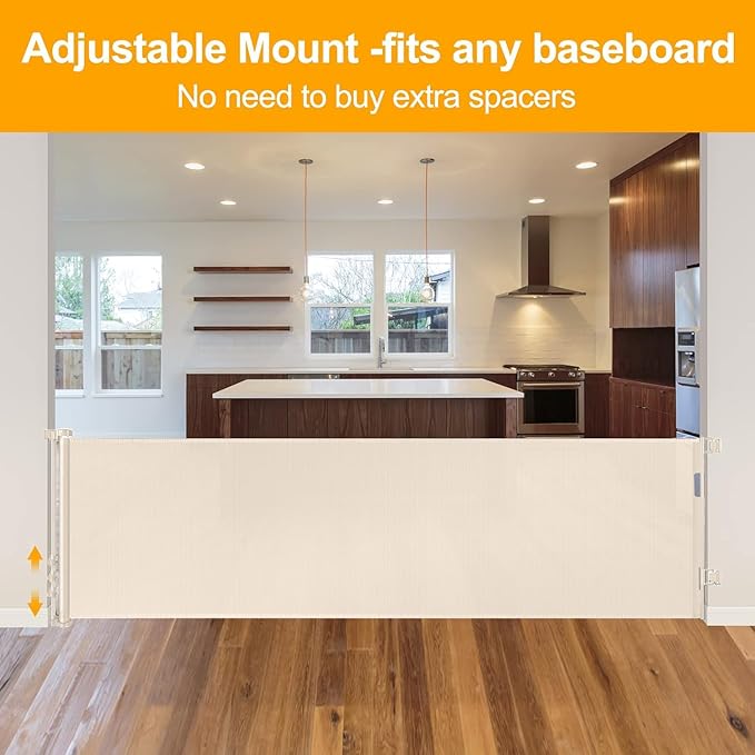 - [Fits Any Baseboard ] No need to buy extra spacers, our extra wide retractable pet gate accessories can be adjusted up and down to fit Any Baseboard.