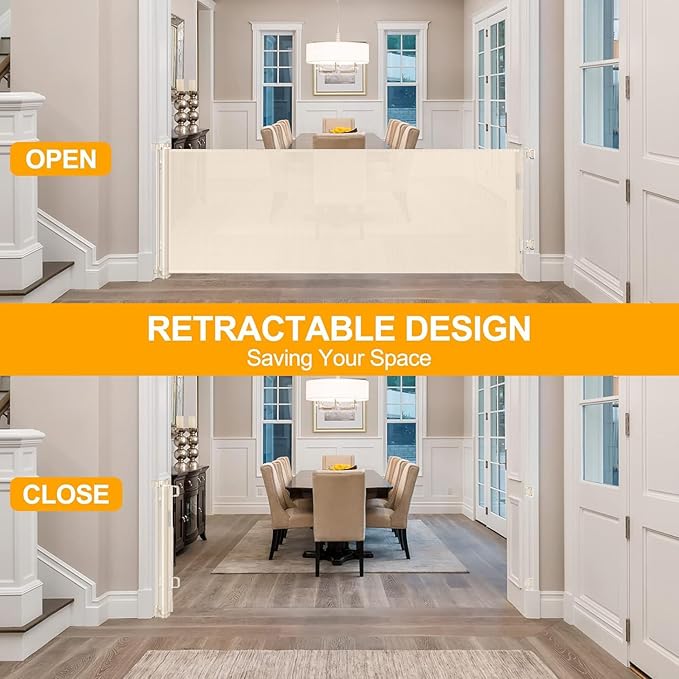 - [Retractable Gate ] You can roll it up when not in use, which saving your space. Unlike iron gate rails, this new retractable gate has no bottom rails - so there's no tripping hazard. Children and wheelchairs are easy to pass through, and elegant design works well with your home style. It is effective to stop your children from entering dangerous space.