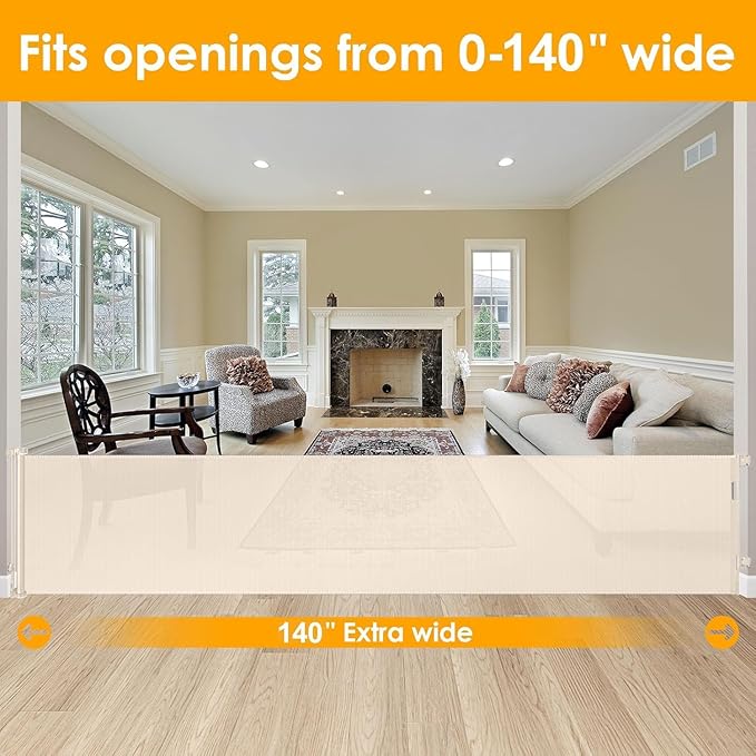 - [140 Inch Extra Wide Baby Gate ] This retractable baby gates Fits openings up to 140" wide and is 33" tall which can be adjusted to fit your openings according to your needs. Suitable for babies and dogs.