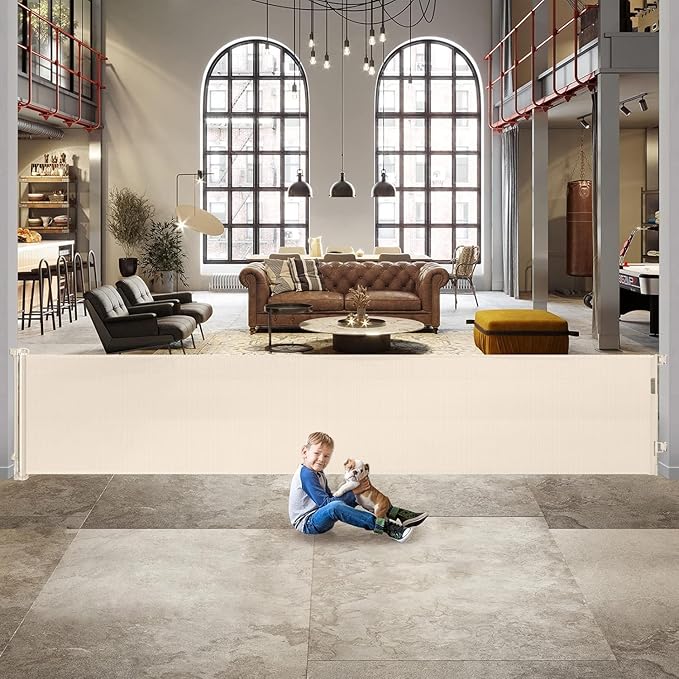 140 Inch Extra Wide Baby Gate Retractable Dog Gates for The House Extra Wide Dog Gates Extra Long Baby Gates Extra Large Dog Gates for Large Openings Outdoor Indoor Retractable Baby Gates (Beige)