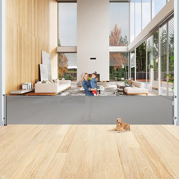 - [Indoor Outdoor Retractable Gate] - Extra large baby gate can be used both indoors and outdoors, such as open kitchens, bottom of stairs, doorways, decks, etc. Create a safe area for babies and pets.
