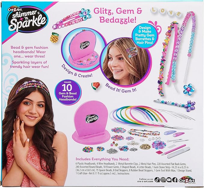 - HEADBANDS AND BARRETTES - Glitz, gem and bedazzle with the amazing Shimmer N Sparkle Headbands and Barrettes! Make beautiful, beaded wire headbands, gem filled plastic headbands, pretty gem barrettes & hair pins! Makes 10 gem and bead fashion headbands in total plus 4 clips.