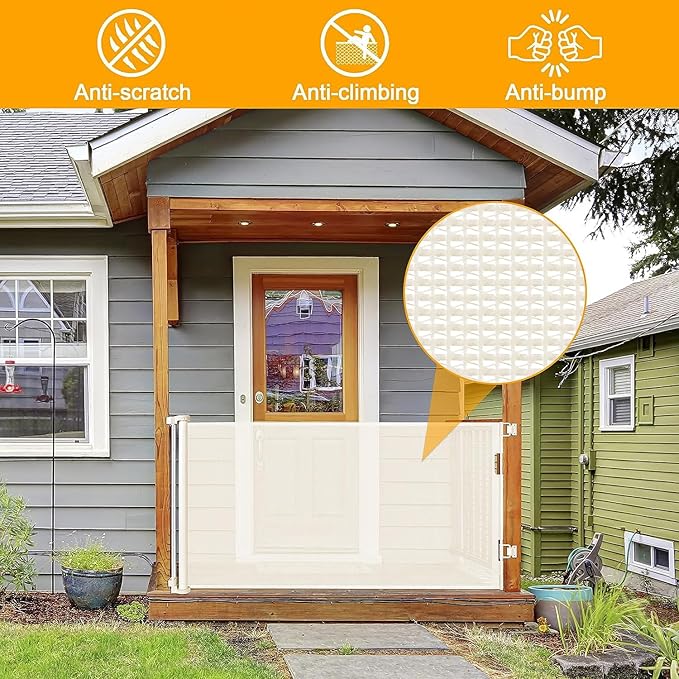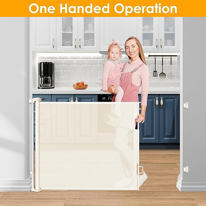 - [Retractable Gate ] You can roll it up when not in use, which saving your space. Unlike iron gate rails, this new retractable gate has no bottom rails - so there's no tripping hazard. Children and wheelchairs are easy to pass through, and elegant design works well with your home style. It is effective to stop your children from entering dangerous space.