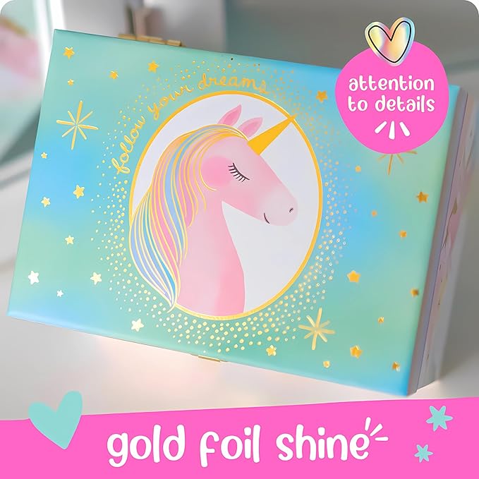 - Unicorn Jewelry Box For Girls - Igniting awe & wonder in imaginative hearts, this musical jewelry box for girls brings radiant smiles to every little girl. Watch as she becomes immersed in the gracefully dancing unicorn, twirling to Beautiful Dreamer