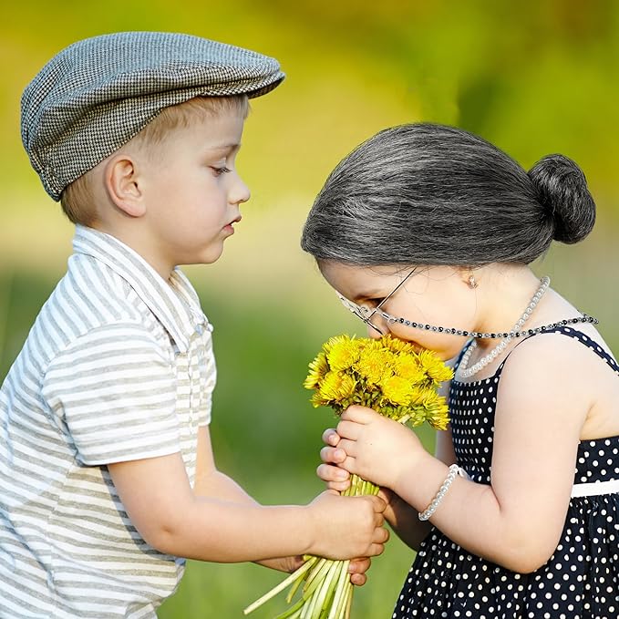 - Product Size - The bun wig measures 13.4 inches, the wig cap is elastic, making it suitable for all children. Come with a 16.53-inch artificial pearl necklace, a 7-inch pearl bracelet, 5.11-inch grandma glasses, and a 25.7-inch glasses chain, offering full set kids old lady costume cosplay props.