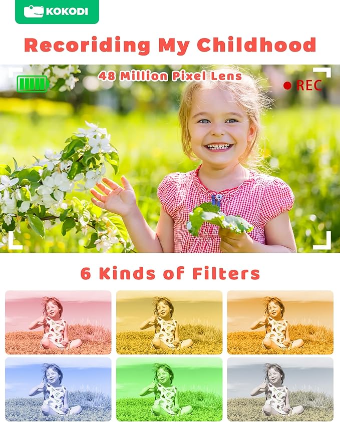 • 📸【New Upgraded Camera for Kids】: KOKODI kids camera equipped with 48MP dual-camera, 8x digital zoom, and 1080P HD video resolution, your kids not only take landscape photos but also take selfies by themselves. The digital camera can easily achieve auto focus, capture wonderful happy moments for your kids, cultivate their creativity and imagination and realize the little photographer's dream!
