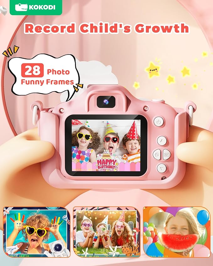 • 🎞️【Multi-functional Camera Toy for Kids】: KOKODI selfie camera has 28 cartoon sticker photo frames, 6 filters and 3 puzzle games. The unicorn toy is also equipped with functions such as selfie, video, music player, recording, and timed shooting, meet kid's various needs. Moreover, you can download the photos and videos to a computer using the included Micro-USB Cord, helping kids to cherish the children's happy memories with their family.