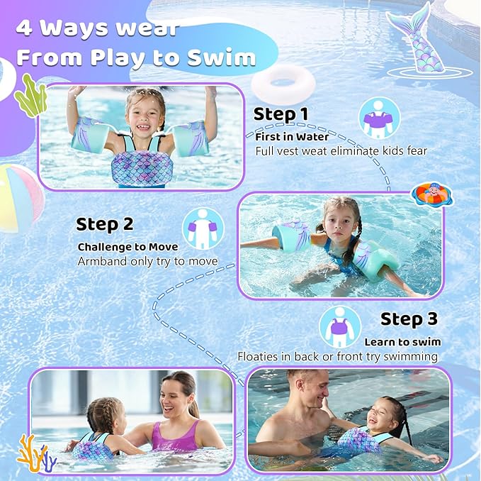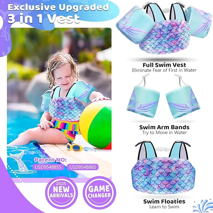- 2024 Exclusive 3 in 1 Design:Unique armband detachable design offers multiple wearing options. By gradually reducing the use from a full vest arm bands and floties to eventually swimming unaided.It‘s the best gift choice for kids in all water activities.Have the Patent Approved No.:USD954885S & USD954889S