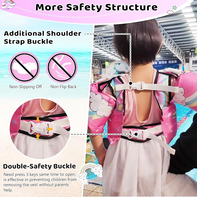 - 【More Safety Structure】Upgraded double safety buckle,The back button need press 3 keys same time to open, is effective in preventing children from removing the vest without parental help. Added shoulder strap buckle not only prevent the shoulder strap slipping off, but also prevent kids flip back in the water .