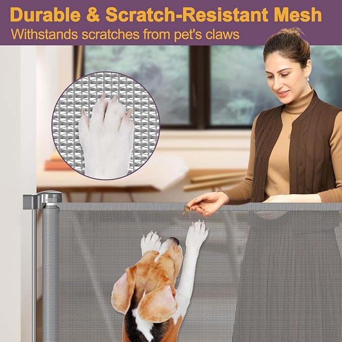 - Durable & Scratch-Resistant Mesh: Our extra tall retractable dog gate is made of upgraded mesh lining that is durable, soft and scratch resistant. It can withstand the scratching of your dog's paws.