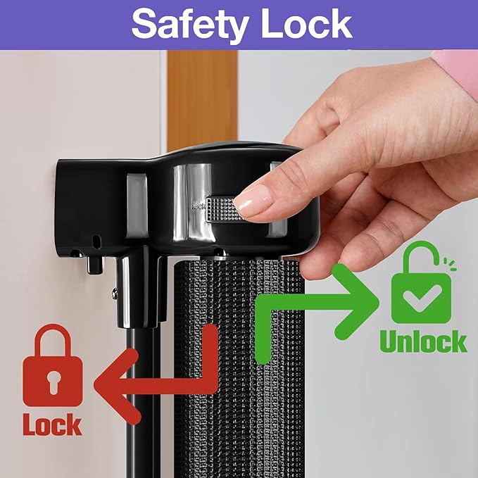 - Easy One-Handed Operation: Our tall retractable gate features a safety lock that allows adults to easily open and close the extra long dog gate with 1 hand, while preventing accidental access by kids and pets.