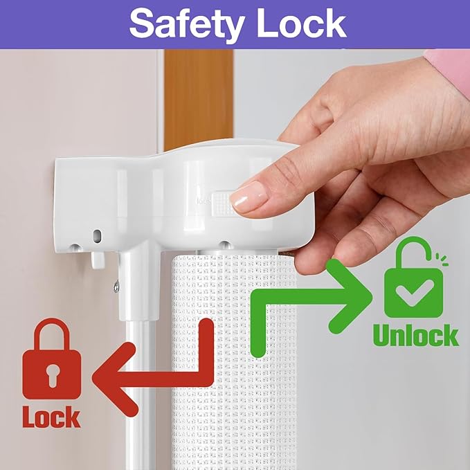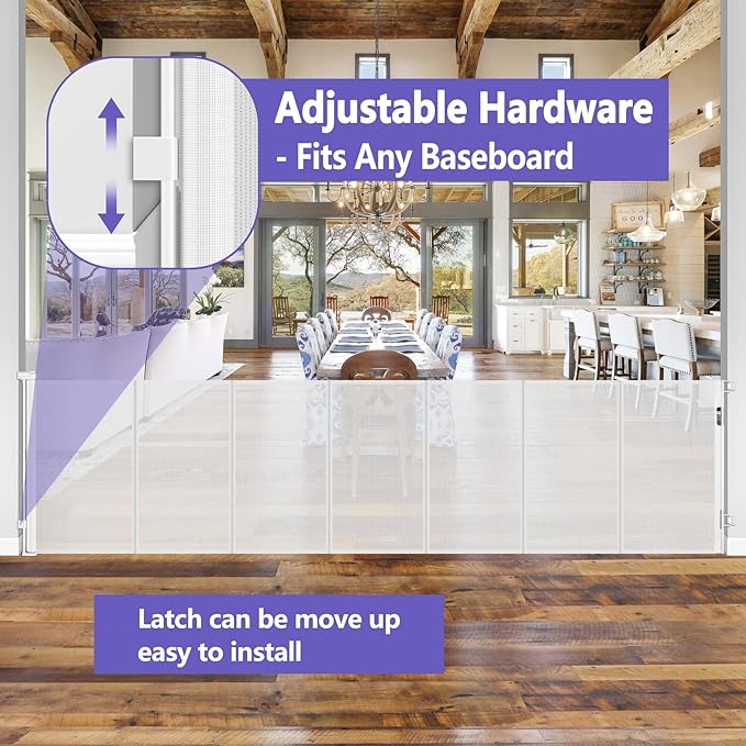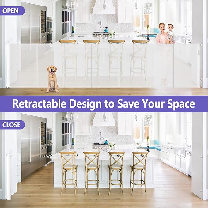 - Space-Saving Retractable Design: Our extra tall pet gate smoothly retracts when not in use, saving space without wrinkling the mesh. No bottom bar when retracted—no tripping hazard, allowing easy access.