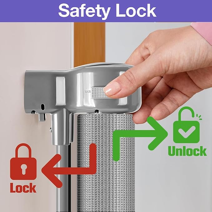 - Easy One-Handed Operation: Our extra wide retractable gate features a safety lock that allows adults to easily open and close the extra large baby gate with 1 hand, while preventing accidental access by kids and pets.