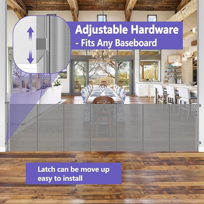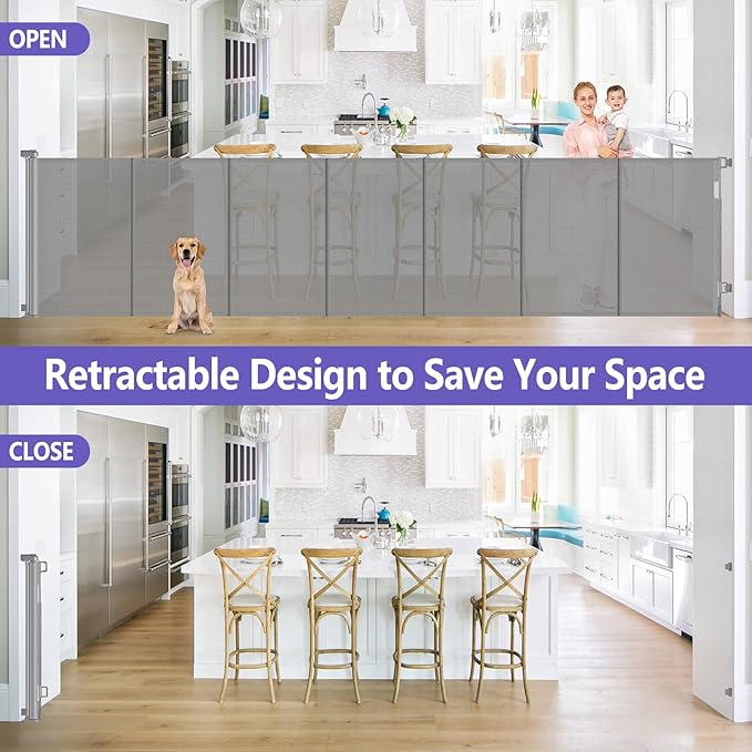 - Space-Saving Retractable Design: Our extra tall pet gate smoothly retracts when not in use, saving space without wrinkling the mesh. No bottom bar when retracted—no tripping hazard, allowing easy access.
