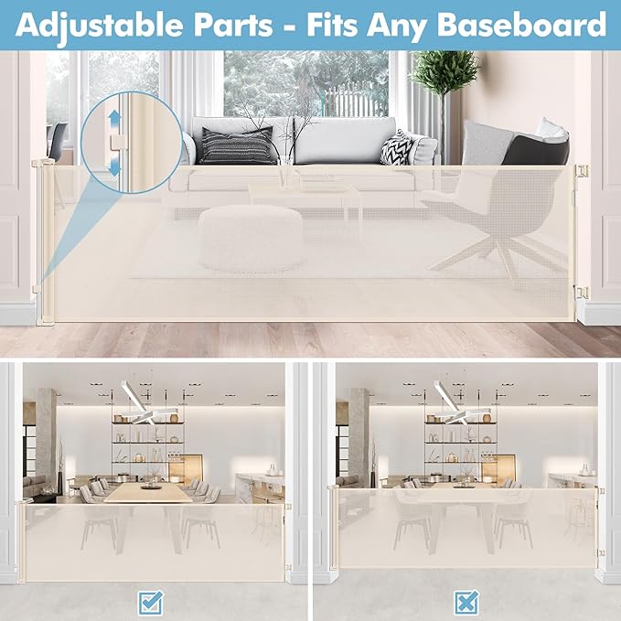 - Sturdy and Anti-Scratch Mesh: Our retractable mesh gate is made of soft and sturdy anti-scratch mesh that not only won't bump your kid, but also resists pet paws.
