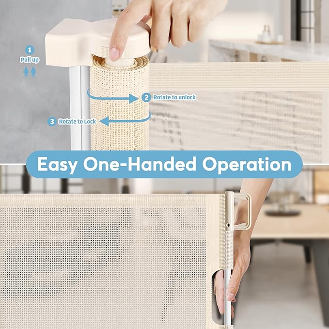 - Easy One-Handed Operation: Our extra wide baby gate has a one-handed locking and unlocking mechanism. Once locked, the retractable fence securely closes to prevent accidental opening by babies and pets.