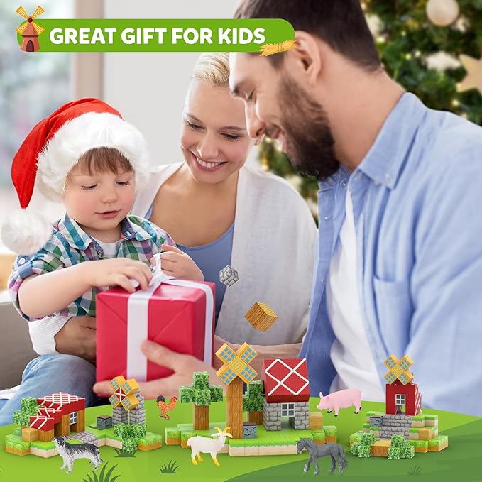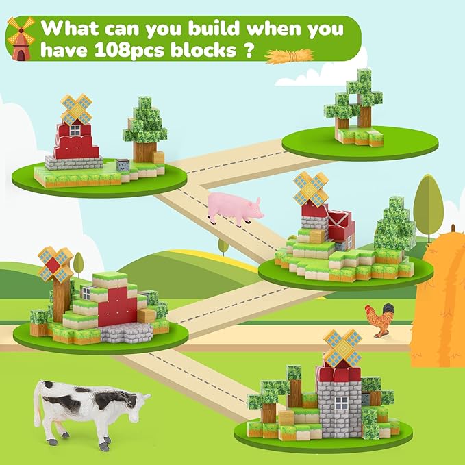 - FARM THEME: Step into the magical world of farm theme with our Magnetic Blocks set! This 110-piece set features vibrant magnetic blocks with 6 adorable animals, sparking endless creativity and fun for kids.
