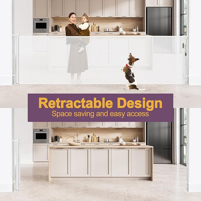 - 130 Inch Extra Wide & Retractable Design: Our extra tall and wide baby gate fits 0-130" wide openings. You can adjust the width to fit your wide opening according to your needs. When not in use, the mesh can be completely retracted away to save you space.