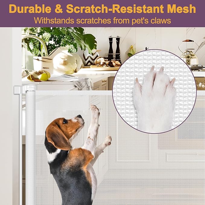 - Durable & Scratch-Resistant Mesh: Our extra tall retractable baby gate is made of upgraded mesh lining that is durable, soft and scratch resistant. It can withstand the scratching of your dog's paws.