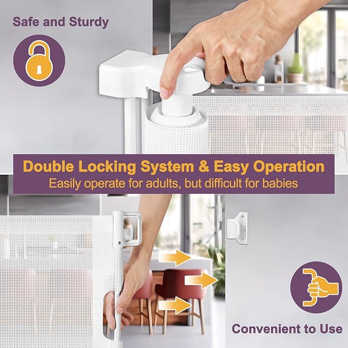 - Safe for Babies & Pets: All gate lines are tested to the safety standards. Upgraded double locking system to limit kids or pets’ access and keep them safe. Adults can easily open and close with one hand, but babies and pets cannot unlock it.