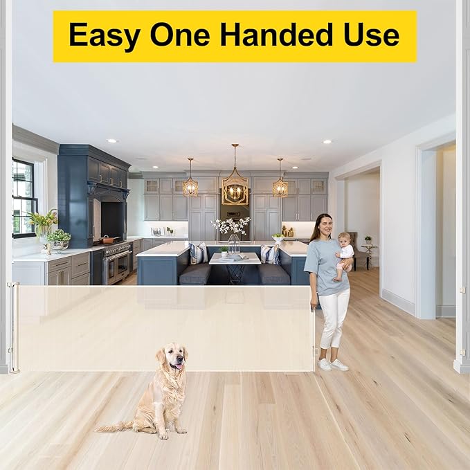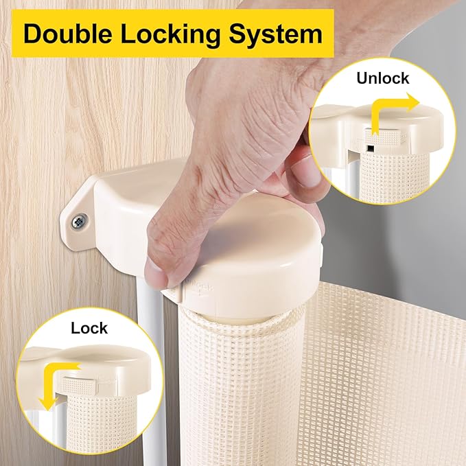 - [Easy to Use with One Hand] The retractable dog gate is designed with a double locking system. Adults can easily lock and unlock the baby gates, but children cannot.