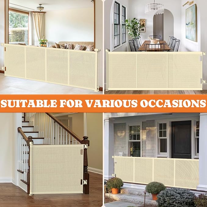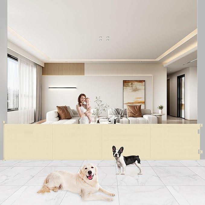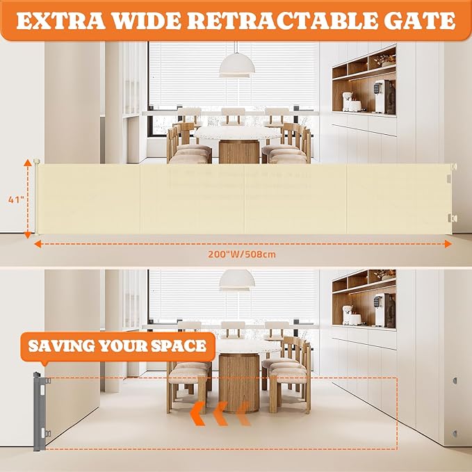 - 200" Extra Wide Retractable Design: Extend our retractable baby gate up to 200" wide, with 41" heightened gates preventing pets from jumping out. Designed to save space, this dog gate is convenient when needed and easily tucked away out of sight when not in use. Note: Please ensure the installation height is above 41" before purchasing