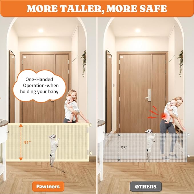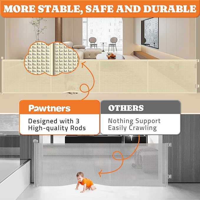- Stable and Reliable: The Pawtners pet gate indoors comes with three high-quality rods to support the mesh baby gate, preventing it from toppling over. These rods also protect the gate's mesh from tearing and keep little ones from crawling underneath