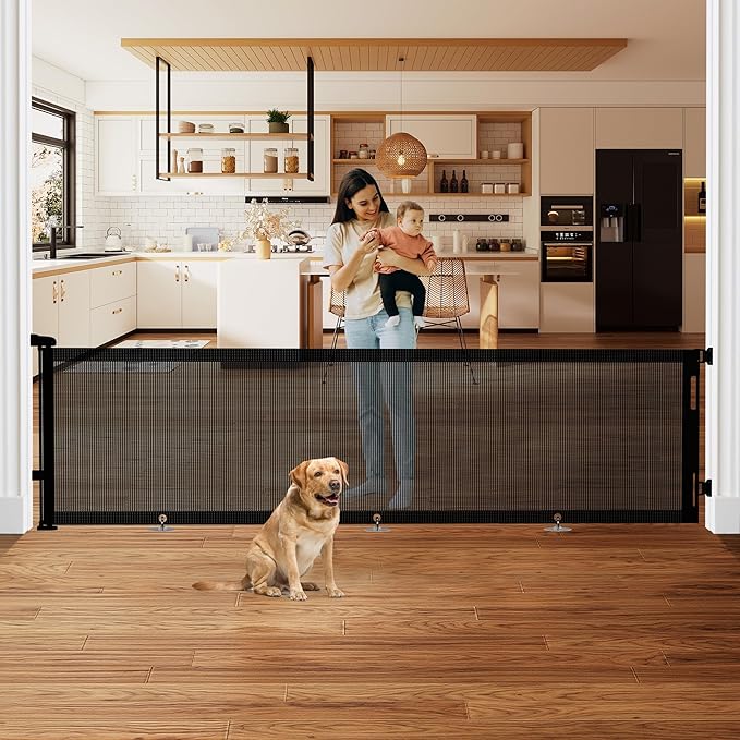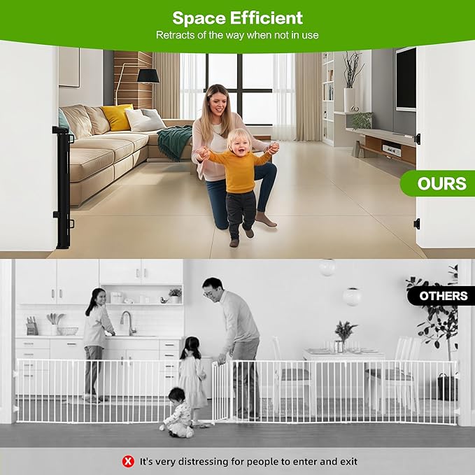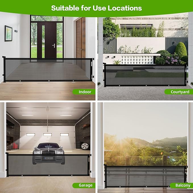 - 【Suitable for Indoor and Outdoor Use】This retractable gate can be used in a variety of indoor and outdoor settings, such as open-concept kitchens, stairways, entryways, bedrooms, living rooms, around fireplaces, on patios, decks, in garages, and other restricted areas. Keeping your children and pets away from hazardous locations.