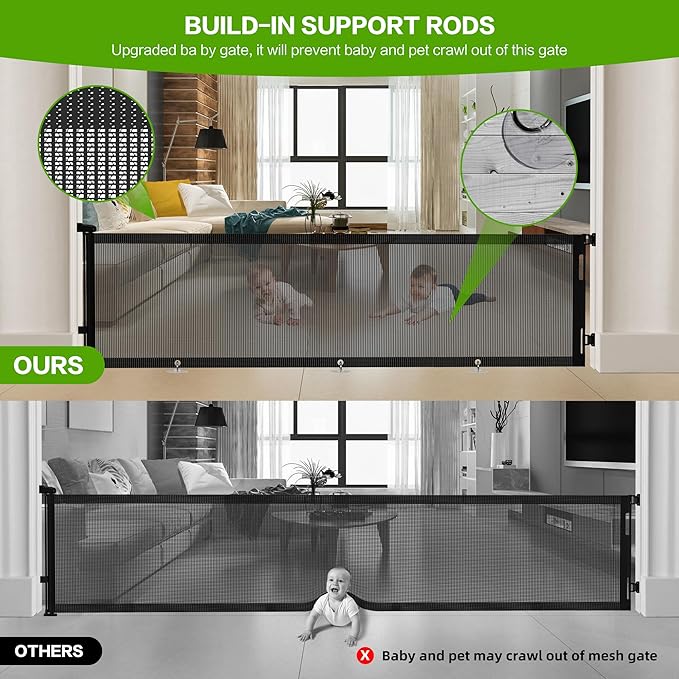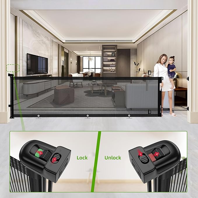 - 【Specially Designed for Busy Moms】We have 2 locking mechanisms. One is a mesh locking mechanism that automatically locks after a countdown timer, and also controls the extension and retraction of the mesh. The other is a gate locking mechanism - simply unlock the gate right where you are, and the gate will open. And the gate will automatically lock when closed, for quick and easy access. Unlike other baby gates, you don't have to go through a multi-step process of unlocking the mesh, then opening the gate, and finally remembering to lock the mesh again. Our baby gate saves you that hassle.