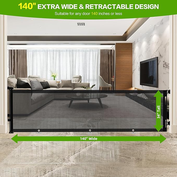 Retractable Baby Gate, Mesh Baby Extra Wide Gate to Prevent from Crawling Underneath, 34" Tall, Extends up to 140" Wide, Mesh Dog Gate for Garage, Play Area, Deck, Indoor/Outdoor