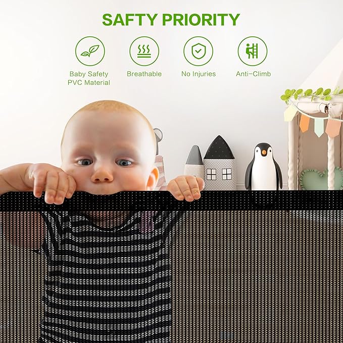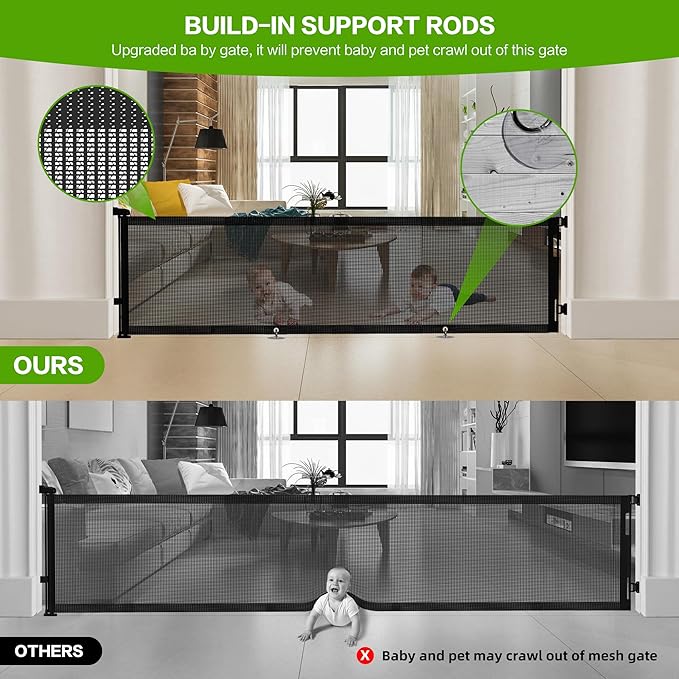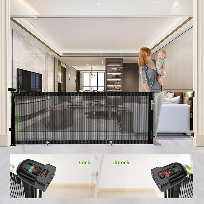 - 【Specially Designed for Busy Moms】We have 2 locking mechanisms. One is a mesh locking mechanism that automatically locks after a countdown timer, and also controls the extension and retraction of the mesh. The other is a gate locking mechanism - simply unlock the gate right where you are, and the gate will open. And the gate will automatically lock when closed, for quick and easy access. Unlike other baby gates, you don't have to go through a multi-step process of unlocking the mesh, then opening the gate, and finally remembering to lock the mesh again. Our baby gate saves you that hassle.