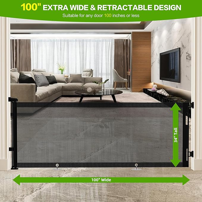 Retractable Baby Gate, Mesh Baby Extra Wide Gate to Prevent from Crawling Underneath, 34" Tall, Extends up to 100" Wide, Mesh Dog Gate for Garage, Play Area, Deck, Indoor/Outdoor