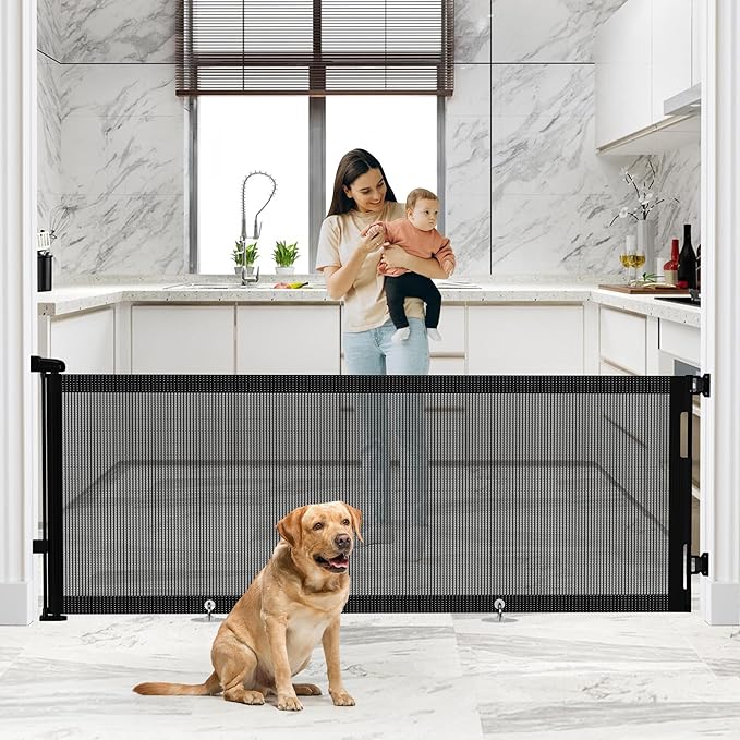 - 【Suitable for Indoor and Outdoor Use】This retractable gate can be used in a variety of indoor and outdoor settings, such as open-concept kitchens, stairways, entryways, bedrooms, living rooms, around fireplaces, on patios, decks, in garages, and other restricted areas. Keeping your children and pets away from hazardous locations.