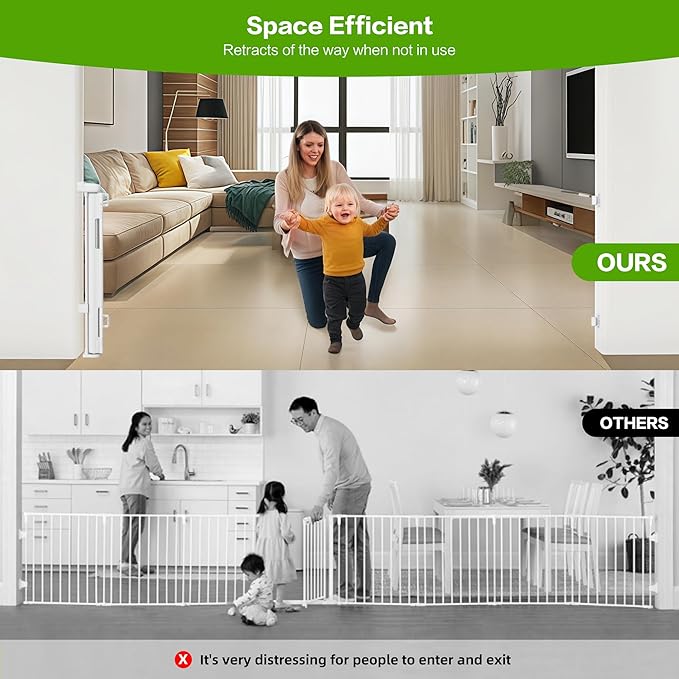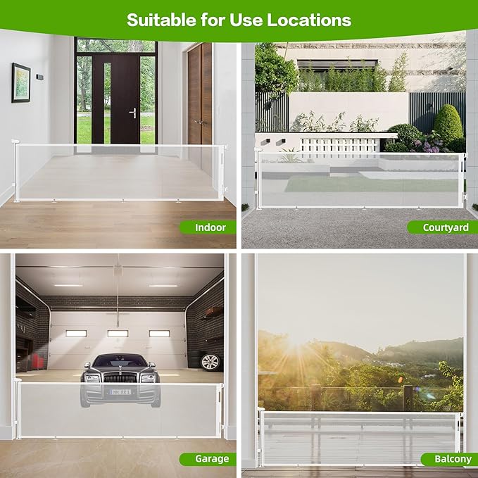 - 【Suitable for Indoor and Outdoor Use】This retractable gate can be used in a variety of indoor and outdoor settings, such as open-concept kitchens, stairways, entryways, bedrooms, living rooms, around fireplaces, on patios, decks, in garages, and other restricted areas. Keeping your children and pets away from hazardous locations.