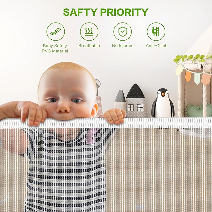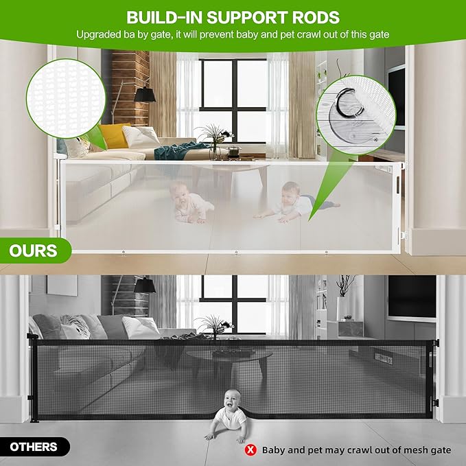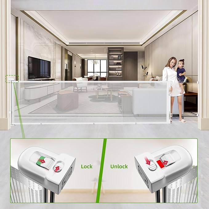 - 【Specially Designed for Busy Moms】We have 2 locking mechanisms. One is a mesh locking mechanism that automatically locks after a countdown timer, and also controls the extension and retraction of the mesh. The other is a gate locking mechanism - simply unlock the gate right where you are, and the gate will open. And the gate will automatically lock when closed, for quick and easy access. Unlike other baby gates, you don't have to go through a multi-step process of unlocking the mesh, then opening the gate, and finally remembering to lock the mesh again. Our baby gate saves you that hassle.