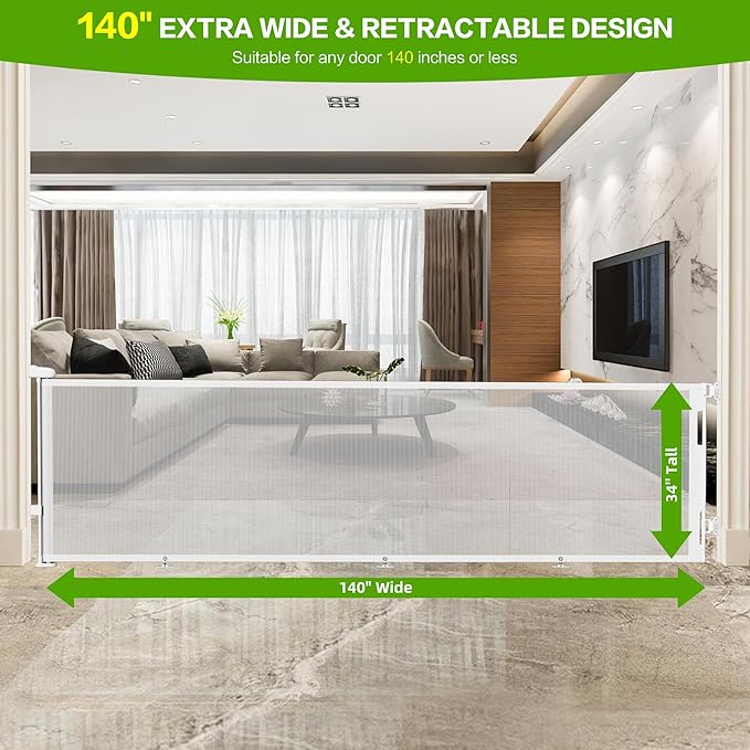 Retractable Baby Gate, Mesh Baby Extra Wide Gate to Prevent from Crawling Underneath, 34" Tall, Extends up to 140" Wide, Mesh Dog Gate for Garage, Play Area, Deck, Indoor/Outdoor