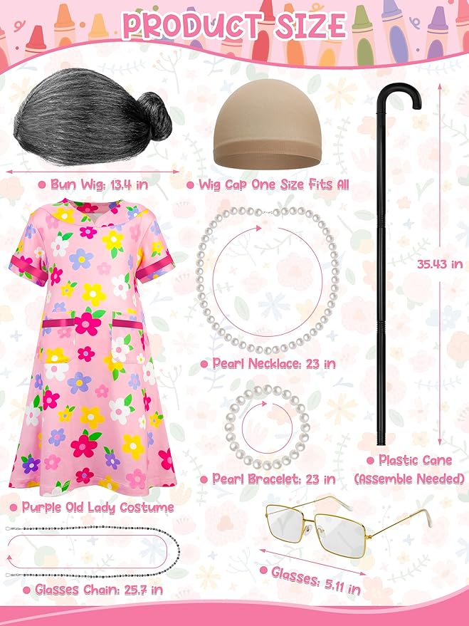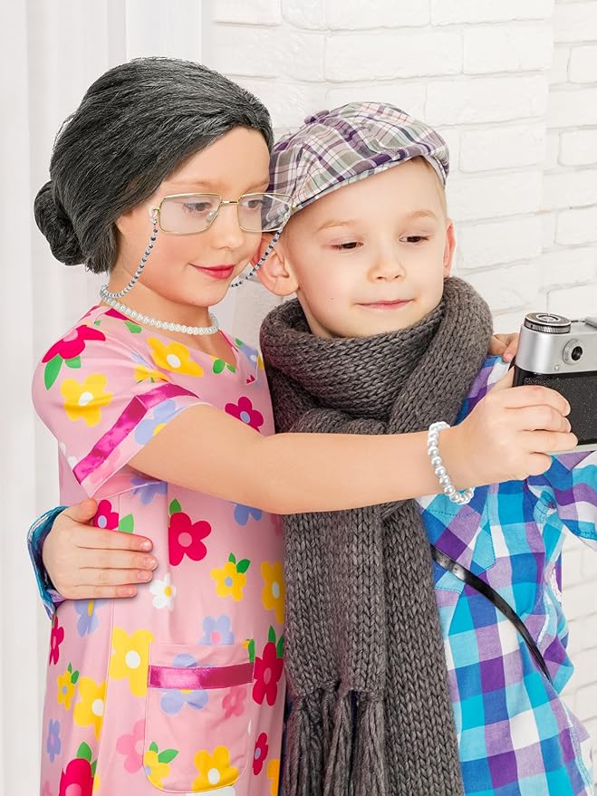 - Everything You Need: Huskein comprehensive costume set includes a grandma dress, black white bun wig, granny glasses with a chain, pearl necklace, pearl bracelet, wig cap, and kids cane. Perfect for creating the perfect old lady costume for kids.